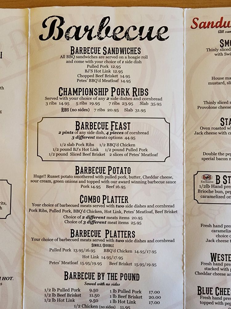 2 pints of any side dish, 4 pieces of cornbread. 1/2 slab Pork Ribs, 1/2 BBQ'd Chicken, 1/2 pound BJ's Hot Link, 1/2 pound Pulled Pork, 1/2 pound Sliced Beef Brisket, 2 slices of Petes' Meatloaf