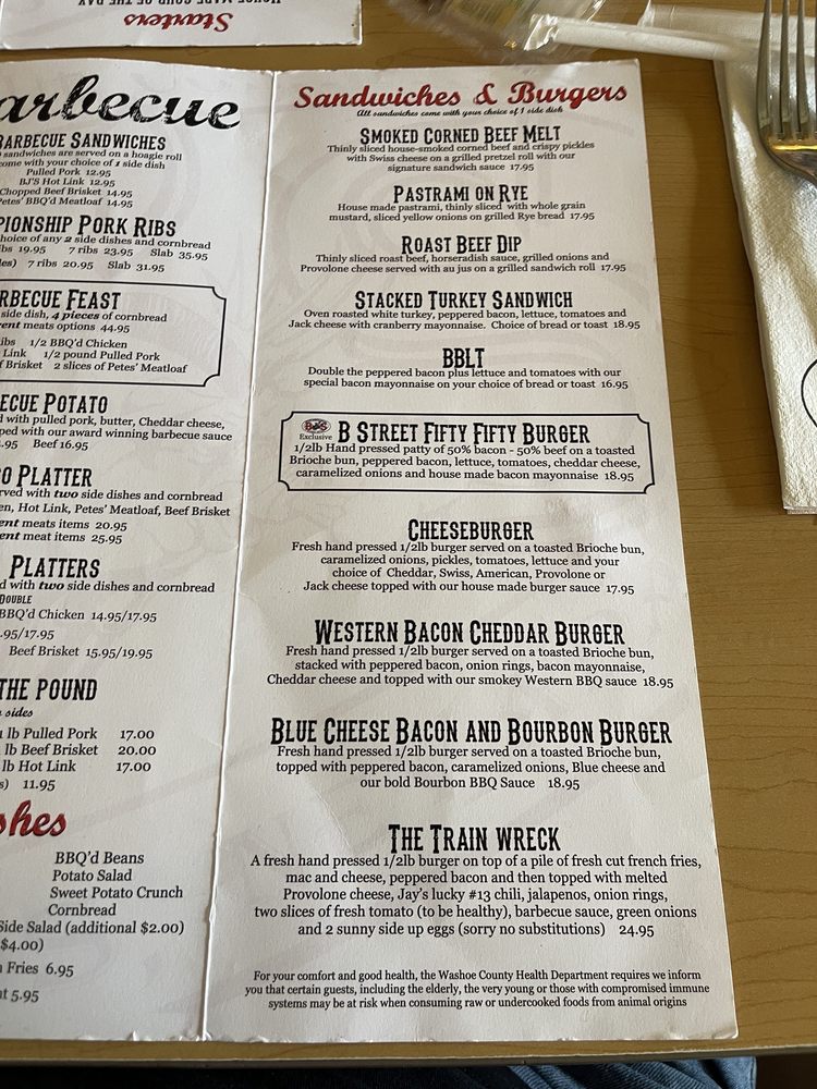 A fresh hand pressed 1/2lb burger on top of a pile of fresh cut french fries, mac and cheese, peppered bacon and then topped with melted Provolone cheese, Jay's lucky #13 chili, jalapenos, onion rings, two slices of fresh tomato (to be healthy), barbecue sauce, green onions and 2 sunny side up eggs (sorry no substitutions)