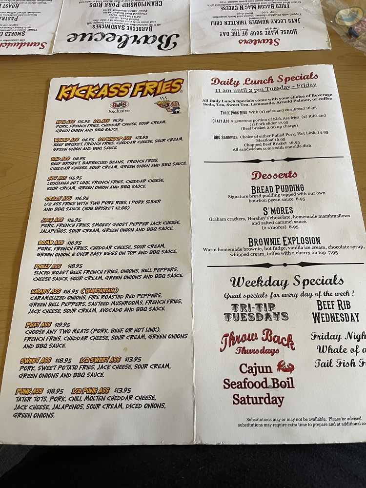 choose any two meats (pork, beef, or hot link), french fries, cheddar cheese, sour cream, green onions and bbq sauce